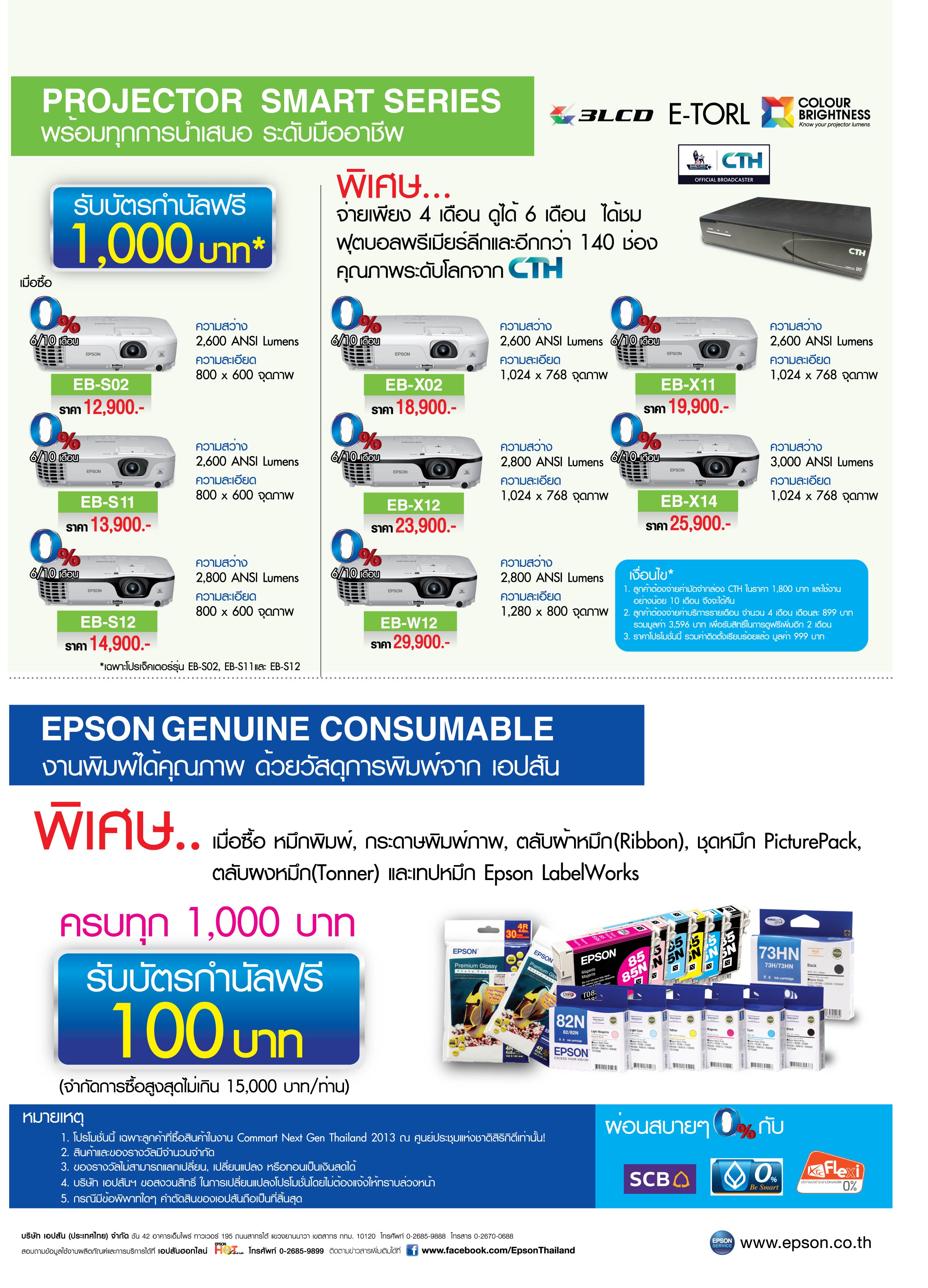 เอปสัน ขนทัพสินค้ายอดนิยม ทั้งอิงค์เจ็ตพรินเตอร์ เลเซอร์พรินเตอร์ และโปรเจ็คเตอร์ จัดโปรโมชั่น ลดกระหน่ำในงานคอมมาร์ต เน็กซ์เจน 2013 พิเศษ! เฉพาะในงานสามารถลงทะเบียนที่บูทเอปสัน เพื่อลุ้นรับสิทธิ์ซื้อพรินเตอร์แทงค์แท้ ได้ในราคาลดถึง 50% กับเอปสัน L550 พริน เตอร์ แทงค์แท้ มัลติฟังก์ชั่น สุดประหยัด ที่ตอบโจทย์ทุกการใช้งาน ในราคาเพียง 4,495 บาท (รวมภาษีมูลค่าเพิ่ม) จาก 8,990 บาท จำกัดวันละ 16 เครื่อง และพรินเตอร์แทงค์แท้น้องใหม่ M-100 เพื่อการพิมพ์งานขาวดำโดยเฉพาะ เพียง 2,995 บาท (รวมภาษีมูลค่าเพิ่ม) จาก 5,990 บาท จำกัดวันละ 8 เครื่อง ผู้สนใจสามารถ ลงทะเบียนที่บูธเอปสัน ได้ทุกวัน วันละ 3 รอบ ได้แก่ 10.30, 14.00 และ 17.30 น. เท่านั้น สอบถามเงื่อนไขและรายละ เอียดเพิ่มเติมได้ที่ เอปสัน ฮอตไลน์ 02-685-9899, www.epson.co.th และ www.facebook.com/EpsonThailand พบโปรโมชั่นสินค้ามากมายและร่วมสนุกับกิจกรรมได้ที่บูธเอปสัน ในงานคอมมาร์ต เน็กซ์เจน 2013 ระหว่างวันที่ 20 - 23 มิ.ย. นี้ ที่ศูนย์การประชุมแห่งชาติสิริกิติ์