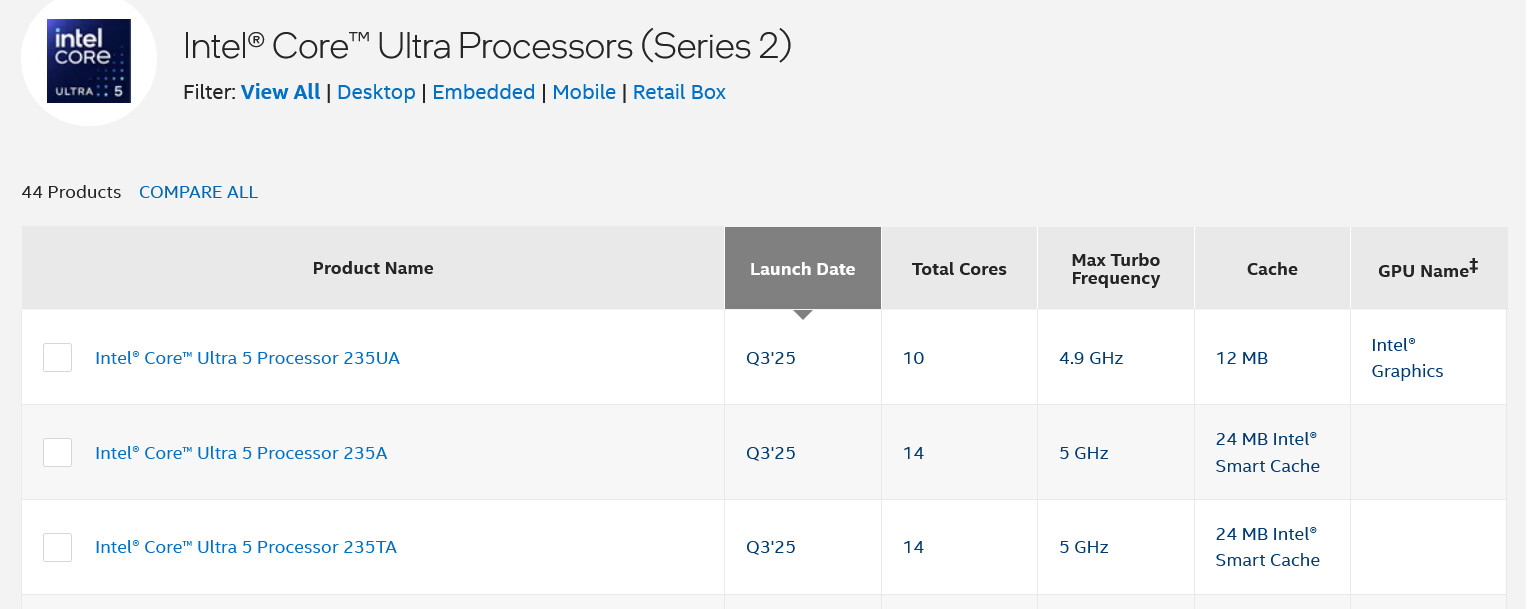Intel ได้เปิดตัวโปรเซสเซอร์ Arrow Lake รุ่นใหม่ 3รุ่นในกลุ่มผลิตภัณฑ์ Ultra 5 โดยเป็นส่วนหนึ่งของกลุ่มผลิตภัณฑ์ Ultra 5 เสริมประสิทธิภาพตัวเลือกระดับเริ่มต้นด้วยรุ่น Ultra 5 235A, 235TA และ 235UA โปรเซสเซอร์ Ultra 5 235A และ 235TA โดยทั้งคู่มีแกนประมวลผลทั้งหมด 14 คอร์ โดย 6 คอร์เป็นแกนประมวลผลประสิทธิภาพสูง performance cores และ 8 คอร์เป็น efficient cores พร้อม 14 เธรด ทั้งสองรุ่นสามารถทำความเร็วเทอร์โบได้ถึง 5 GHz บนแกนประมวลผลประสิทธิภาพสูง ในขณะที่แกนประมวลผลประสิทธิภาพสูงสามารถทำความเร็วได้สูงสุด 4.4 GHz ความแตกต่างหลักระหว่าง CPU ทั้งสองรุ่นคือการใช้พลังงานและความถี่พื้นฐาน Ultra 5 235A ทำงานที่ 65 W โดยมีแกนประมวลผลประสิทธิภาพสูงทำงานที่ความถี่พื้นฐาน 3.4 GHz Intel Ultra 5 235TA ได้รับการออกแบบให้ประหยัดพลังงานมากขึ้น โดยทำงานเพียง 35 วัตต์ โดยมีแกนประมวลผลประสิทธิภาพสูงทำงานที่ความถี่พื้นฐาน 2.2 GHz เดสก์ท็อปทั้งสองรุ่นนี้ผลิตขึ้นโดยใช้กระบวนการผลิต N3B ของ TSMC และมาพร้อมกับ Smart Cache ขนาด 24 MB สำหรับการวางจำหน่ายน่าจะมีขึ้นในเร็วๆ นี้