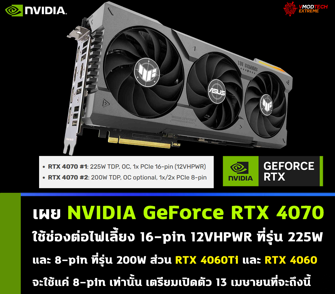 เผย NVIDIA GeForce RTX 4070 รุ่นใหม่ล่าสุดอาจจะใช้ช่องต่อไฟเลี้ยงแบบ 16-pin 12VHPWR ที่รุ่น 225W และ 8-pin power connectors ที่รุ่น 200W เท่านั้น!!!