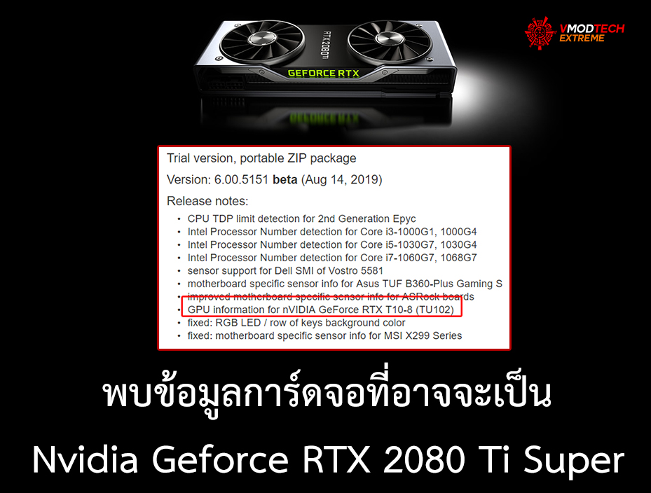 วันนี้ก็มีข่าวจากฝั่ง Nvidia ออกมาให้ชมกันอย่างไม่เป็นทางการครับกับการมีข่าวหลุดของข้อมูลในโปรแกรม AIDA64 beta version 6.00.5151 ที่พบรหัสข้อมูลของการ์ดจอที่อาจจะเป็น Nvidia Geforce RTX 2080 Ti Super ซึ่งมีรหัสในรุ่น Nvidia Geforce RTX T10-8 ที่ใช้ชิบ TU102 โดยมีการคาดกันว่าอาจจะมีความเป็นไปได้อยู่มากเช่นกันที่จะเป็นการ์ดจอ Nvidia Geforce RTX 2080 Ti Super หรืออาจจะไม่ใช่เลยก็เป็นได้และมีความเป็นไปได้รหัสข้อมูลดังกล่าวอาจจะเป็น RTX 2080 Ti, Titan RTX, Quadro RTX 8000 และ Quadro RTX 6000 ซึ่งก็ต้องตามกันต่อครับว่า Nvidia จะปิดท้ายด้วยการ์ดจอตัวท๊อปหรือไม่ น่าติดตามครับ