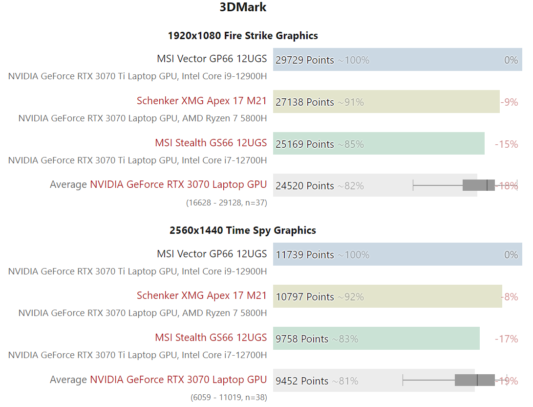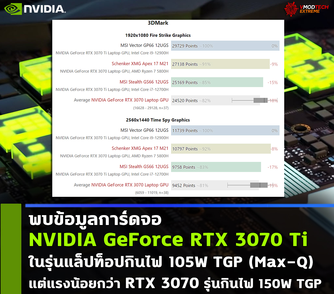 วันนี้ก็มีข่าวจากฝั่ง Nvidia ออกมาให้เราได้ชมกันครับกับข่าวของการ์ดจอ NVIDIA GeForce RTX 3070 Ti ในรุ่นแล็ปท็อปกินไฟ 105W TGP ที่เปิดเผยจากทาง Notebookcheck พบว่าการ์ดจอ RTX 3070 Ti รุ่นใหม่ล่าสุดในฝั่งแล็ปท็อปที่เน้นกินไฟต่ำในรุ่น Max-Q จาก NVIDIA นั้นช้ากว่ารุ่น RTX 3070 รุ่น Non Ti ที่กินไฟ 150W ซึ่งผลทดสอบนั้นมาจากโน๊ตบุ๊คในรุ่น MSI Stealth GS66 ที่ใช้การ์ดจอ RTX 3070 Ti กินไฟ 105W TGP เทียบกันกับรุ่น Vector GP66 ใช้การ์ดจอ RTX 3070 รุ่นกินไฟ 150W TGP ก็ถือเป็นผลทดสอบที่น่าสนใจครับกับผลที่ออกมาแตกต่างกันประมาณ 8-9% แต่ถ้าทดสอบแบบ synthetic benchmarks ก็จะแรงกว่าประมาณ 24% กับการ์ดจอรุ่นประหยัดไฟ Max-Q สำหรับการเปิดตัวคาดว่าจะเปิดตัวในเร็วๆ นี้