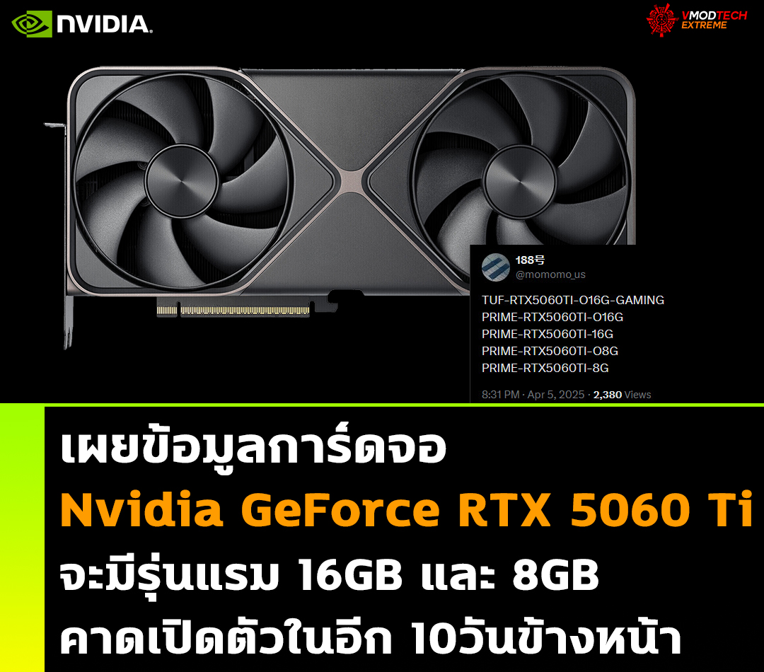 เผยข้อมูลการ์ดจอ Nvidia GeForce RTX 5060 Ti จะมีรุ่นแรม 16GB และ 8GB คาดเปิดตัวในอีก 10วันข้างหน้า