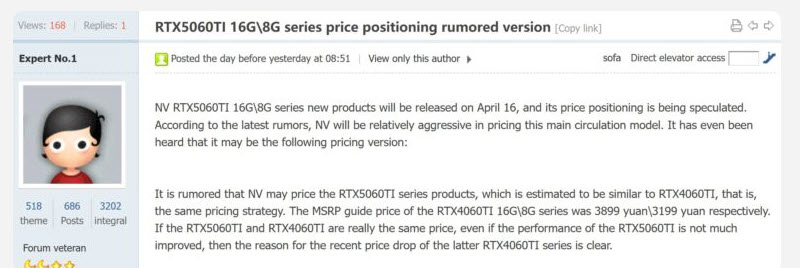 วันนี้ก็มีข่าวจากฝั่ง Nvidia มาอัพเดทให้ทุกท่านได้ชมกันครับกับข่าวของการ์ดจอ NVIDIA GeForce RTX 5060 Ti รุ่นใหม่ที่กำลังจะเปิดตัวในเร็วๆ นี้ออกมาให้เราได้ชมกันครับกับข่าวของ boardchannels.com ทางฝั่งจีนที่เผยข้อมูลออกมาว่า NVIDIA GeForce RTX 5060 Ti รุ่นใหม่ราคาอาจจะเท่ากับ RTX 4060 Ti รุ่นปัจจุบัน โดยตอนนี้ RTX 4060Ti ราคาอยู่ที่ 399USD แต่สำหรับรุ่น Non Ti นั้นเรายังไม่มีข้อมูลเลยครับ สำหรับการเปิดตัวก็คาดว่าจะมีขึ้นในเร็วๆ นี้