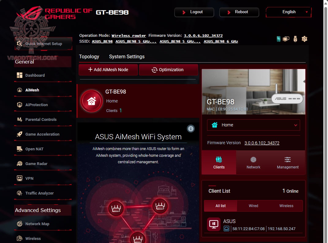 หน้านี้ก็จะเป็นหน้าหลักที่เราสามารถจะปรับโหมดการทำงานของเราเตอร์ ROG Rapture GT-BE98 ตัวนี้ หรือว่าจะทำการอัพเดทเฟิร์มแวร์ก็ทำที่หน้านี้