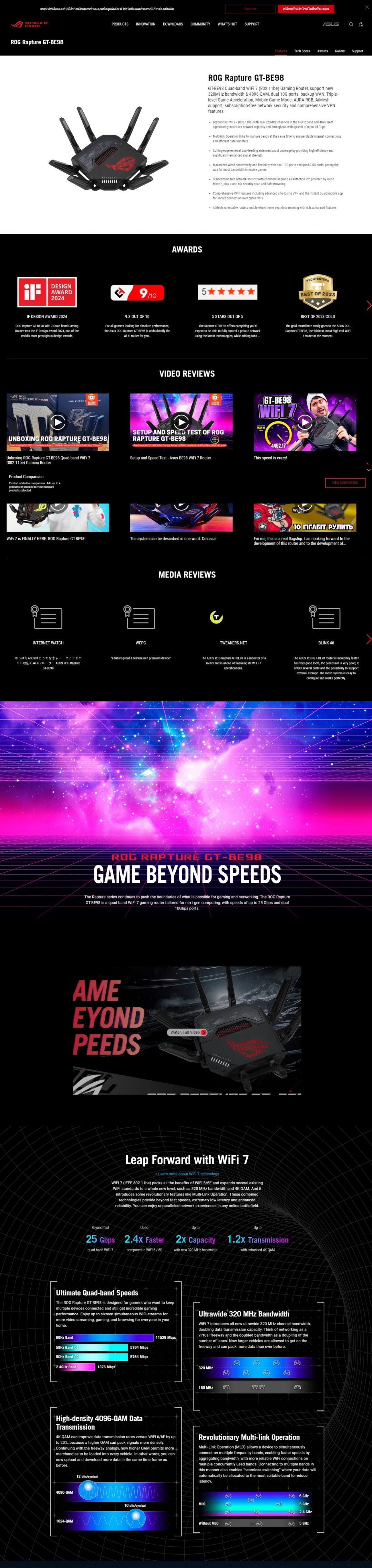 สวัสดีครับ วันนี้เรามาชมบทความอุปกรณ์ด้านเน็ตเวิร์คจากแบรนด์ ASUS กันครับ และวันนี้จะเป็นการรีวิวเราเตอร์มาตรฐานใหม่ล่าสุดคือ WiFi 7 (802.11be) ซึ่งเป็นตัวแรกของเราเลยครับ โดยเรากำลังพูดถึง ROG Rapture GT-BE98 เราเตอร์รุ่นนี้จะเป็นเราเตอร์ระดับสุดของ ASUS การเชื่อมต่อนั้นสามารถปล่อยสัญญาณได้แบบ Quad Band หรือสี่แบนด์เลยนะครับ โดยตัวเราเตอร์นี้อยู่ในคลาส BE25000 ultimate BE performance: 1376+5764+5764+11529 Mbps ซึ่งสามารถแบ่งย่านและความเร็วได้ตามนี้