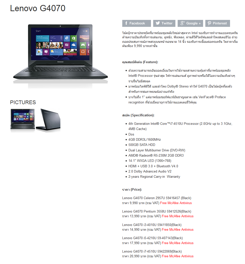 ..........สวัสดีครับวันนี้มาชมโน๊ตบุ๊คจากทาง Lenovo กันบ้าง ในรุ่น Lenovo G4070 เสป็คคร่าวๆของ Lenovo G4070 ก็ 4th Generation Intel® Core™i7-4510U Processor (2.0GHz up to 3.1Ghz, 4MB Cache), VGA AMD® Radeon® HD 8500M 2GB DDR3 (R5-230M) หน้าตา รายละเอียด ความแรง ของ Lenovo G4070 จะเป็นเช่นไรวันนี้มีคำตอบแน่นอนครับ แต่ก่อนอื่น ไปชมรายละเอียดจากผู้ผลิตก่อนครับ