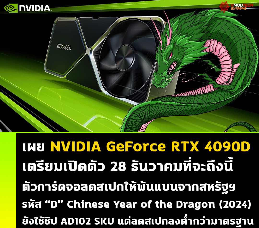 วันนี้ก็มีข่าวจากฝั่ง Nvidia มาอัพเดทให้ทุกท่านได้ชมกันครับกับข่าวของการ์ดจอ NVIDIA GeForce RTX 4090D รุ่นใหม่ที่ได้รับการปรับปรุงสเปกเพื่อวางจำหน่ายในประเทศจีน โดยมีข่าวจากทาง expreview รายงานว่าเตรียมเปิดตัว 28 ธันวาคมที่จะถึงนี้ โดย NVIDIA GeForce RTX 4090D รุ่นใหม่นั้นจะใช้ชื่อย่อ D ตามปีนักษัตของจีนในปีหน้ารวมทั้งตัวการ์ดจอจะทพการปรับสเปกรวมถึงตัวชิปเพื่อให้ผ่านข้อกำหนดจากการที่สหรัฐฯ ทำการแบนในเรื่องชิปนั่นเองครับ