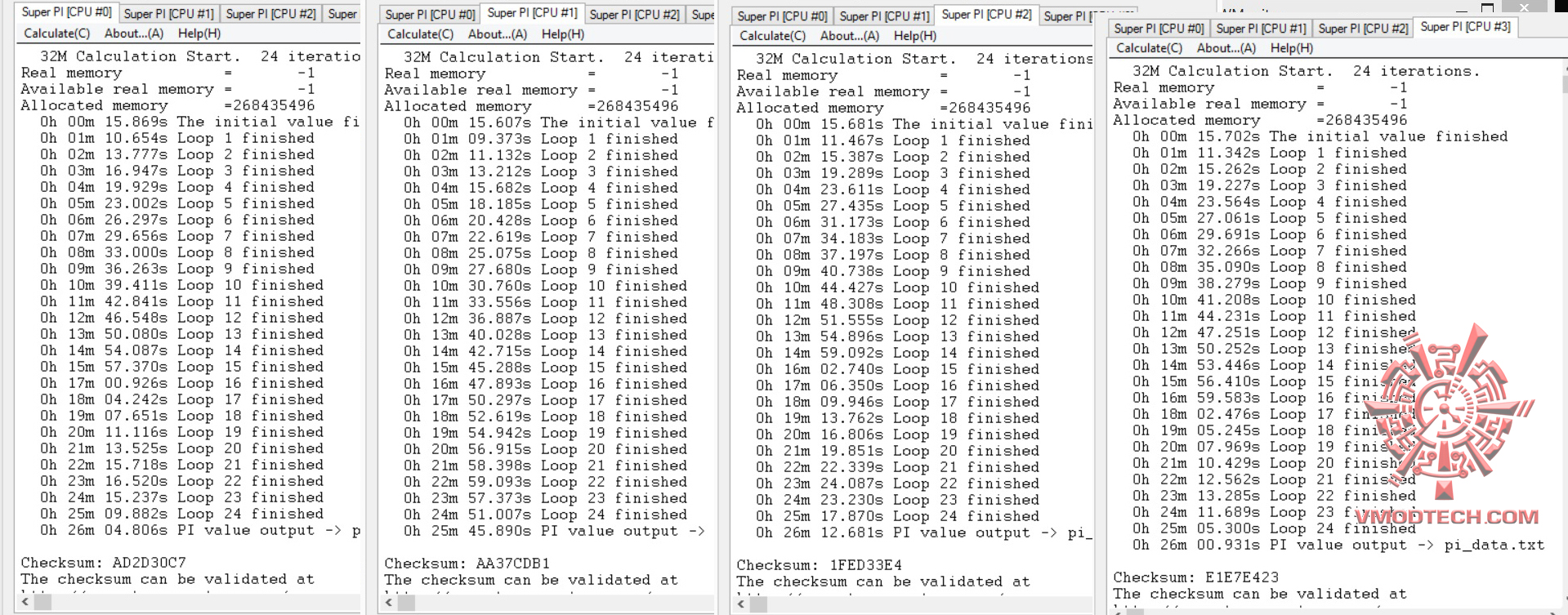 สำหรับ ชุดทดสอบ SuperPI1MBจบไปที่ 21.538วินาที , 32MB จบไป19นาที 30.262วินาที ส่วน HyperPI 32MB ก็ผ่านหมดแรงแบบนิ่งๆใช้งานกันได้จริงอย่างมีเสถียรภาพครับ เฉลี่ยราวๆ 26นาทีต้นๆ ทั้ง 4คอร์