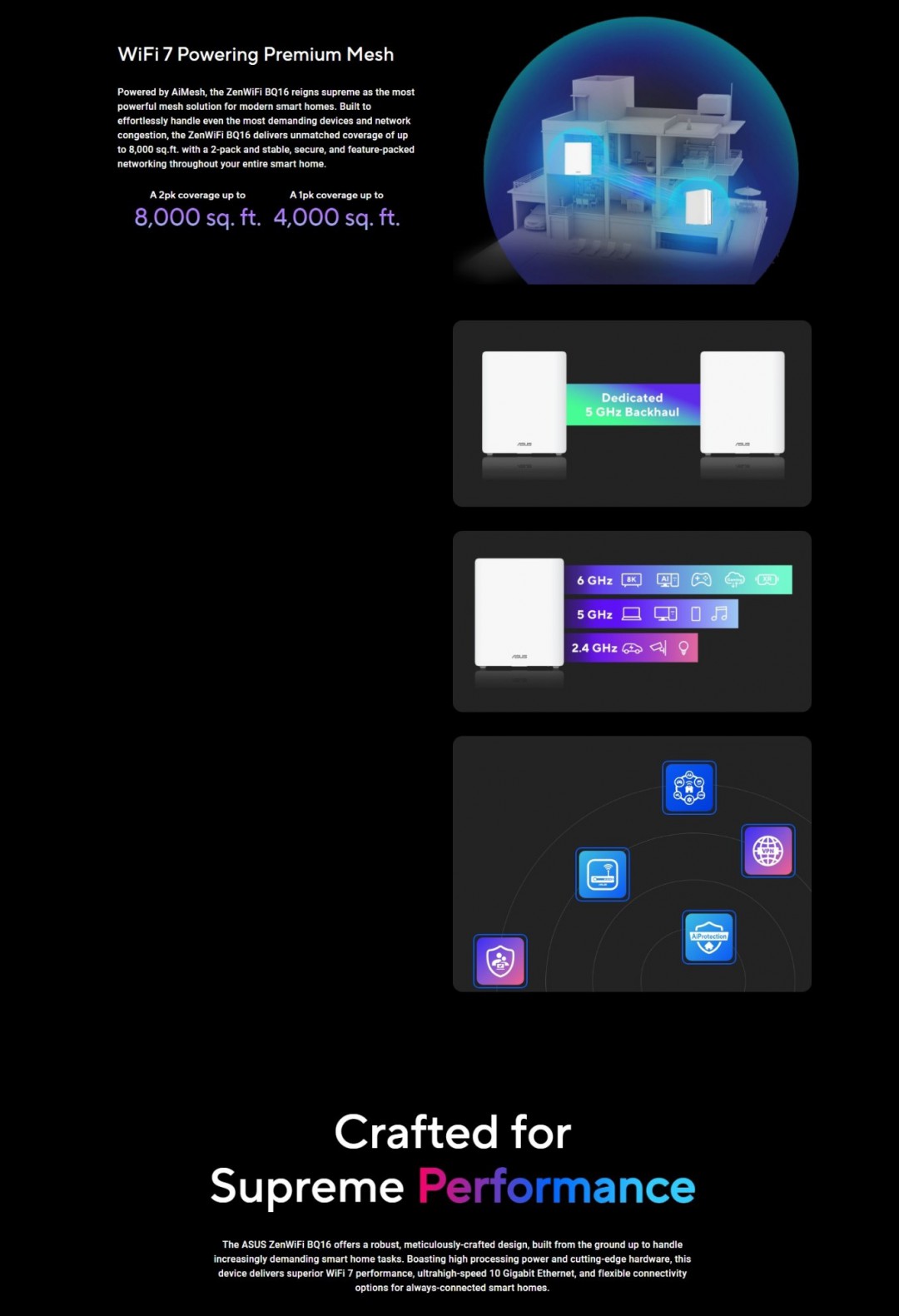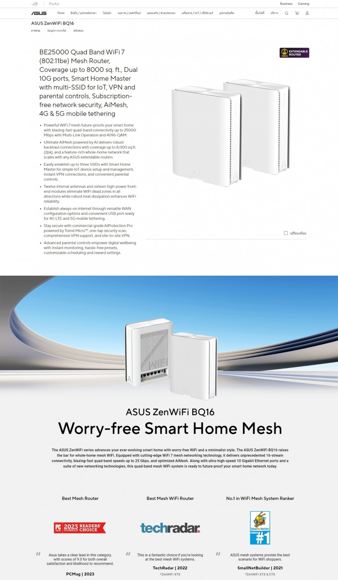 สวัสดีครับ วันนี้เรามาชมบทความอุปกรณ์ด้านเน็ตเวิร์คจากแบรนด์ ASUS กันครับ และวันนี้จะเป็นการรีวิวเราเตอร์มาตรฐานใหม่ล่าสุดคือ WiFi 7 (802.11be) ตัวที่สองในเว็บไซด์ของเรานะครับ โดยเรากำลังพูดถึง ASUS ZenWiFi BQ16 เราเตอร์รุ่นนี้จะเป็น mesh เราเตอร์ระดับสูงของ ASUS การเชื่อมต่อนั้นสามารถปล่อยสัญญาณได้แบบ Quad Band หรือสี่แบนด์ครับ ครอบคลุมพื้นที่กว่า 8000 ตารางฟุต โดยตัวเราเตอร์นี้อยู่ในคลาส BE25000: ซึ่งจะประกอบไปด้วย