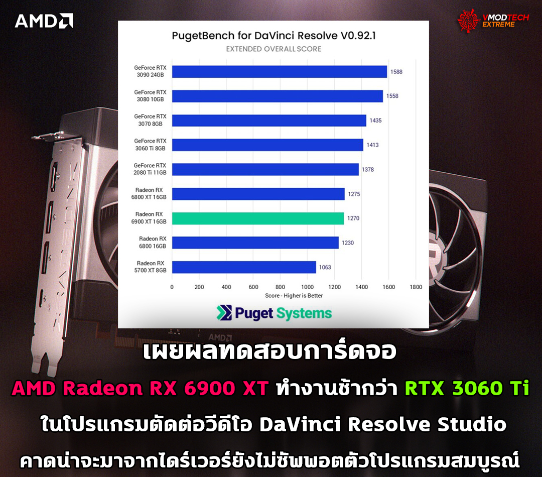 เผยผลทดสอบการ์ดจอ AMD Radeon RX 6900 XT ทำงานช้ากว่า RTX 3060 Ti ในโปรแกรมตัดต่อวีดีโอ DaVinci Resolve Studio