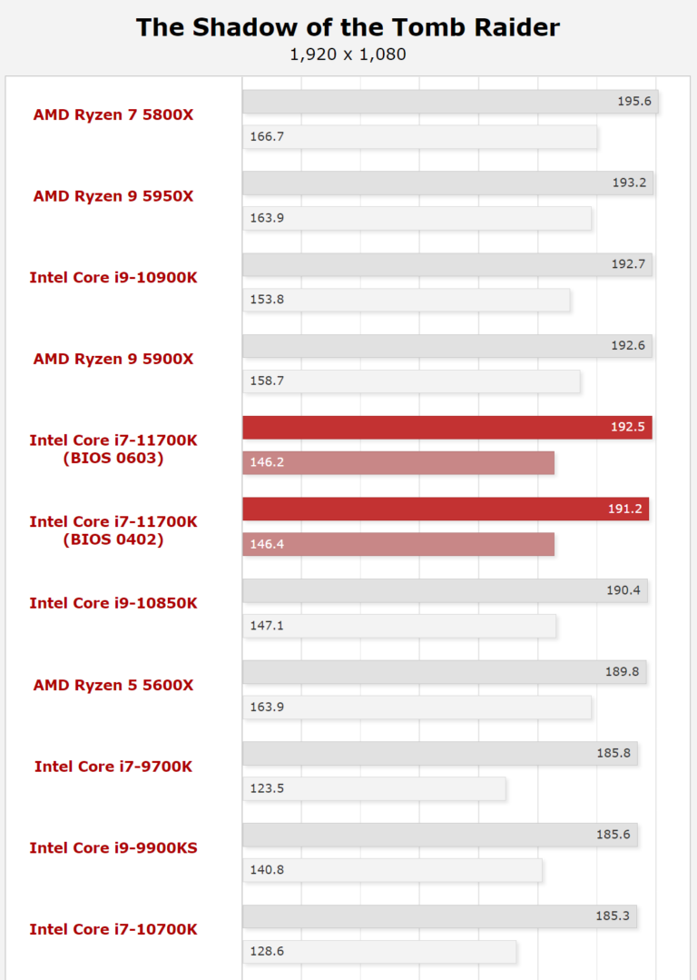 วันนี้ก็มีข่าวจากฝั่ง Intel หลุดออกมาให้ชมอีกครั้งครับกับซีพียู Intel Core i7-11700K รหัส “Rocket Lake-S” รุ่นใหม่ล่าสุดที่ยังไม่เปิดตัวอย่างเป็นทางการ โดยผลทดสอบนั้นเป็นการทดสอบเกมส์มิ่งจากทาง HardwareLuxx ที่มีการอัพเดทไบออสเปรียบเทียบก่อนและหลังทดสอบอีกด้วย โดยซีพียู Intel Core i7-11700K นั้นจะมีจำนวนคอร์ 8C/16T ความเร็ว 3.6 GHz/5.0 GHz อัตราบริโภคไฟ 125W TDP สูงสุด 225W TDP เราไปชมผลทดสอบอย่างไม่เป็นทางการกันเลยครับ
