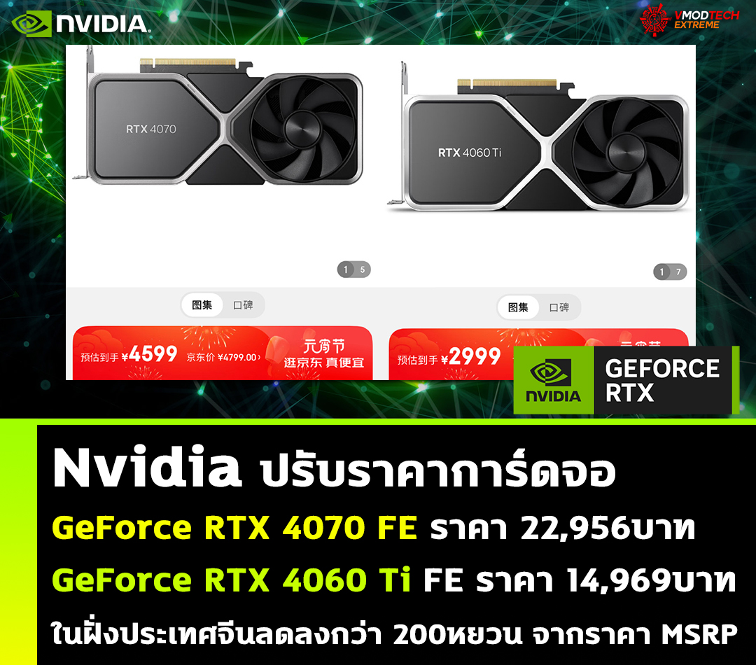 วันนี้ก็มีข่าวจากฝั่ง Nvidia มาอัพเดทให้เราได้ชมกันครับกับข่าวของการ์ดจอ GeForce RTX 4070 และ RTX 4060 Ti Founders Edition ที่มีการปรับราคาลงในฝั่งประเทศจีนทั้ง 2รุ่น โดยราคาจากทาง JD.com อัพเดทของ NVIDIA GeForce RTX 4070 Founders Edition จะอยู่ที่ 4599 RMB / 22956บาท ลดลงกว่า 200 RMB จากราคาเดิมl MSRP ตอนเปิดตัวอยู่ที่ 4799 RMB. ซึ่งลดลงกว่า 30ดอลล่าสหรัฐฯ สำหรับรุ่น NVIDIA GeForce RTX 4060 Ti Founders Edition ลดราคาลงอยู่ที่ 2999 RMB / 14969บาท ลดลงกว่า 200RMB เช่นเดียวกัน โดยราคา MSRP ตอนเปิดตัวอยู่ที่ 3199 RMB. ซึ่งคาดว่าเป็นการปรับราคาเพื่อตอบโต้คู่แข่งอย่าง Radeon RX 7900 GRE หรือไม่ แต่สำหรับในไทยเราราคาก็ยังไม่ลดลงแต่อย่างใดครับ