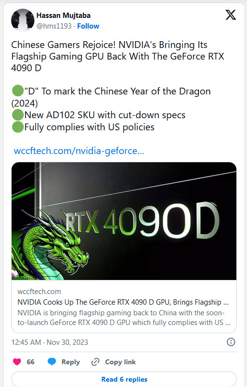 Nvidia เตรียมเปิดตัวการ์ดจอ Nvidia GeForce RTX 4090 D รุ่นใหม่ล่าสุดในประเทศจีนซึ่งสเปกจะปฏิบัติตามข้อกำหนดของสหรัฐอเมริกาเต็มรูปแบบ