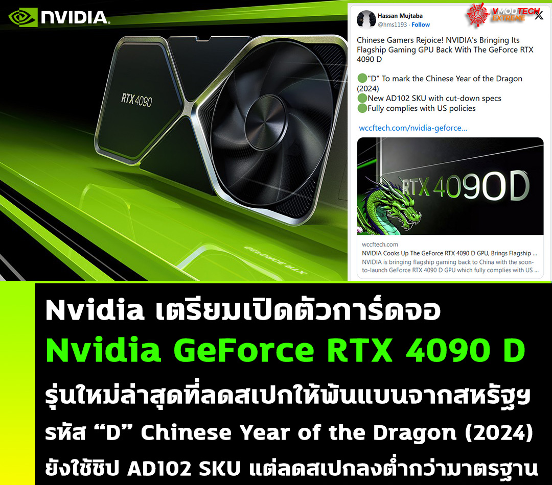 วันนี้ก็มีข่าวจากฝั่ง Nvidia มาอัพเดทให้ทุกท่านได้ชมกันครับกับข่าวของการ์ดจอ Nvidia GeForce RTX 4090 D รุ่นใหม่ล่าสุดในประเทศจีนซึ่งสเปกจะปฏิบัติตามข้อกำหนดของสหรัฐอเมริกาเต็มรูปแบบจากการแบนการ์ดจอและกำหนดสเปกการทำงานในเรื่องของชิปที่ส่งไปยังประเทศจีน โดยการ์ดจอ Nvidia GeForce RTX 4090 D รุ่นใหม่ล่าสุดจะมีรหัสรุ่น D ต่อท้ายซึ่งหมายถึงเป็นปีแห่งมังกร Chinese Year of the Dragon (2024) โดยก่อนหน้านี้การ์ดจอ GeForce RTX 4090 ที่ถูกแบนจากประเทศนี้ เนื่องจากคะแนน TPP (Total Processing Performance) ที่มากกว่า 4800 คะแนน ซึ่งตัวชิปนั้นยังคงใช้ AD102 SKU แต่จะลดสเปกลงเพื่อให้ผ่านข้อจำกัดในการแบนของสหรัฐฯ และน่าจะไปถึงความสามารถของ AI ก็น่าจะถูกจำกัดเช่นกัน จากข่าวนี้บรรดาเกมเมอร์ชาวจีนก็น่าจะดีใจไม่น้อยครับเพราะการ์ดจอรุ่นท็อปนั้นขาดแคลนเพราะถูกนำไปดัดแปลงเปลี่ยนโซลูชั่นให้ใช้งานกับ AI เป็นหลัก และในอนาคตนั้นก็ต้องรอดูครับว่าการ์ดจอที่จะวางขายในจีนจะต้องปรับเปลี่ยนด้วยหรือไม่เพราะว่าในอนาคต Nvidia จะเริ่มใช้ HBM3e ในไตรมาสที่ 1 ปี 2024 ด้วย Hopper H200, HBM4 คาดว่าจะเปิดตัวภายในปี 2026