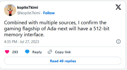 วันนี้ก็มีข่าวจากฝั่ง Nvidia หลุดออกมาให้เราได้ชมกันครับกับข่าวของการ์ดจอ NVIDIA RTX 4090 Ti ที่มีรายงานว่าไม่มีแผนที่จะเปิดตัวจากการรายงานของ Kopite7kimi แม้ว่า Nvidia จะเปิดตัว 4070/4060 Ti ไปแล้วก็ตามครับ เหตุผลเนื่องจาก RTX 4090 ถือเป็นการ์ดจอที่ทรงพลังที่สุดที่มีอยู่ในปัจจุบันแรงกว่าคู่แข่งอย่างมากจึงไม่จำเป็นต้องเปิดตัวในตอนนี้ แต่ก็มีรายงานว่า Nvidia จะเปิดตัว GeForce RTX 5090 ที่จะมาพร้อมบัสหน่วยความจำขนาด 512 บิต ในอนาคตแทนที่ครับ ซึ่งบัส 512Bit นั้นถือเป็นสิ่งที่น่าสนใจไม่น้อยครับนับตั้งแต่การ์ดจอ GTX 280 ที่มีบัส 512Bit เมื่อนานมาแล้ว Nvidia ก็ไม่ได้ขยับบัสหน่วยความจำขนาด 512 บิต อีกเลยครับและเมื่อวิเคราะห์แล้วนั้นเป็นไปได้ว่า Nvidia อาจจะใช้แรมหน่วยความจำ GDDR7 ด้วยความเร็วสูงสุด 32 Gbps บนการ์ดจอรุ่นถัดไปจะส่งผลให้มีแบนด์วิดท์สูงถึง 2TB/s แรงกว่า RTX 4090 เป็นสองเท่าเลยทีเดียวครับ แต่ก็มีการคาดการณ์ครับว่า Nvidia อาจจะยังไม่ใช้แรม GDDR7 ในเร็วๆ นี้ ก็รอดูกันครับว่าการคาดการณ์สเปกนั้นจะเป็นจริงหรือไม่ น่าติดตามครับ